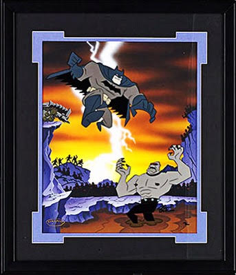 The Dark Knight Returns as been adapted for animation twice. The second time as full, true adaptation done in two parts (or combined as a deluxe feature). The first time as a short sequence as part of an anthology episode of the Bruce Timm classic Batman: The Animated Series during it’s later re-styled run. Since my absolute favorite what-got-me-into-comics comic was done as part of my absolute favorite television series (yes, something animated is my favorite series, and it’s Batman…shocker, right?) of course I have this multiple signed seri-cel from the episode hanging in my living room: